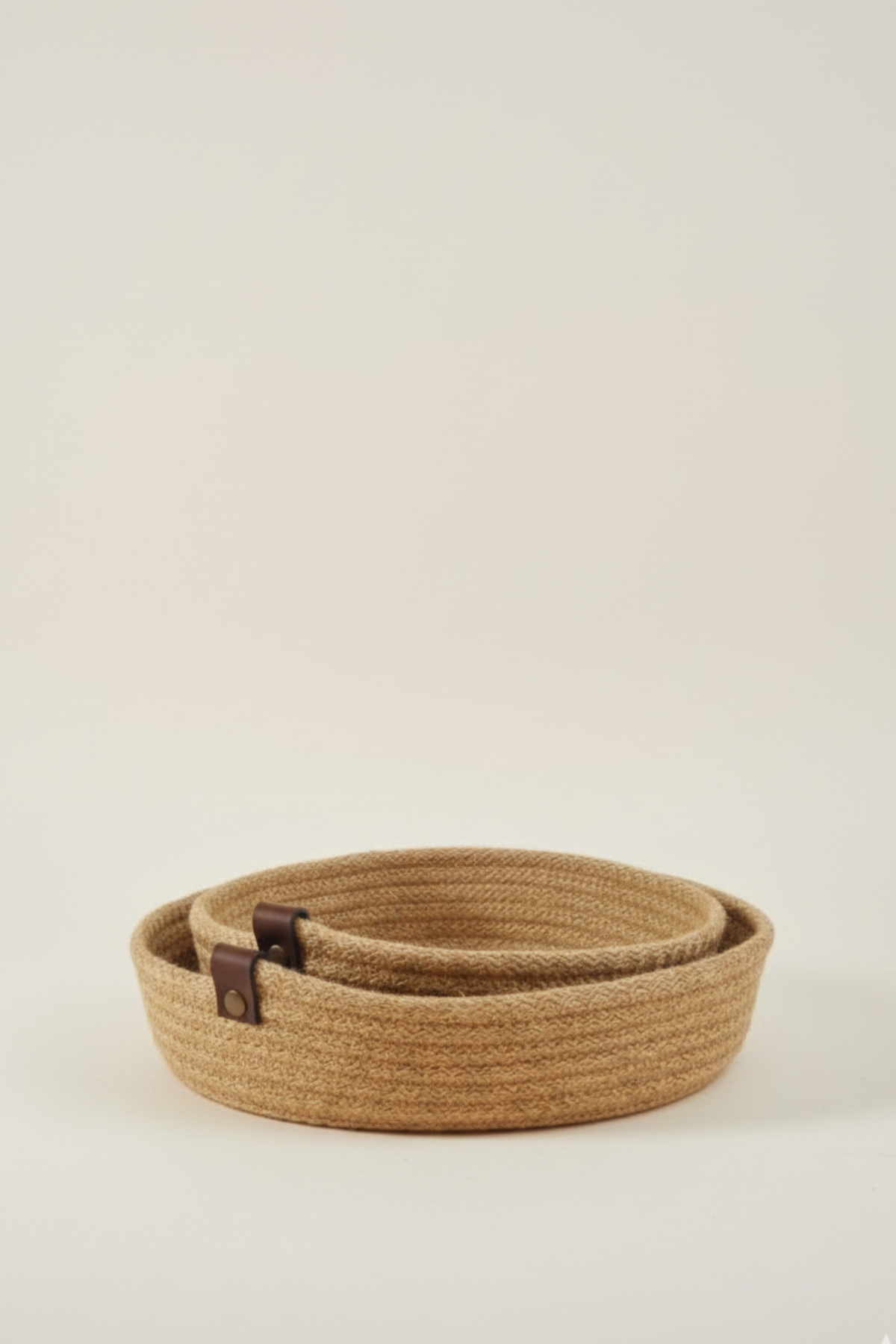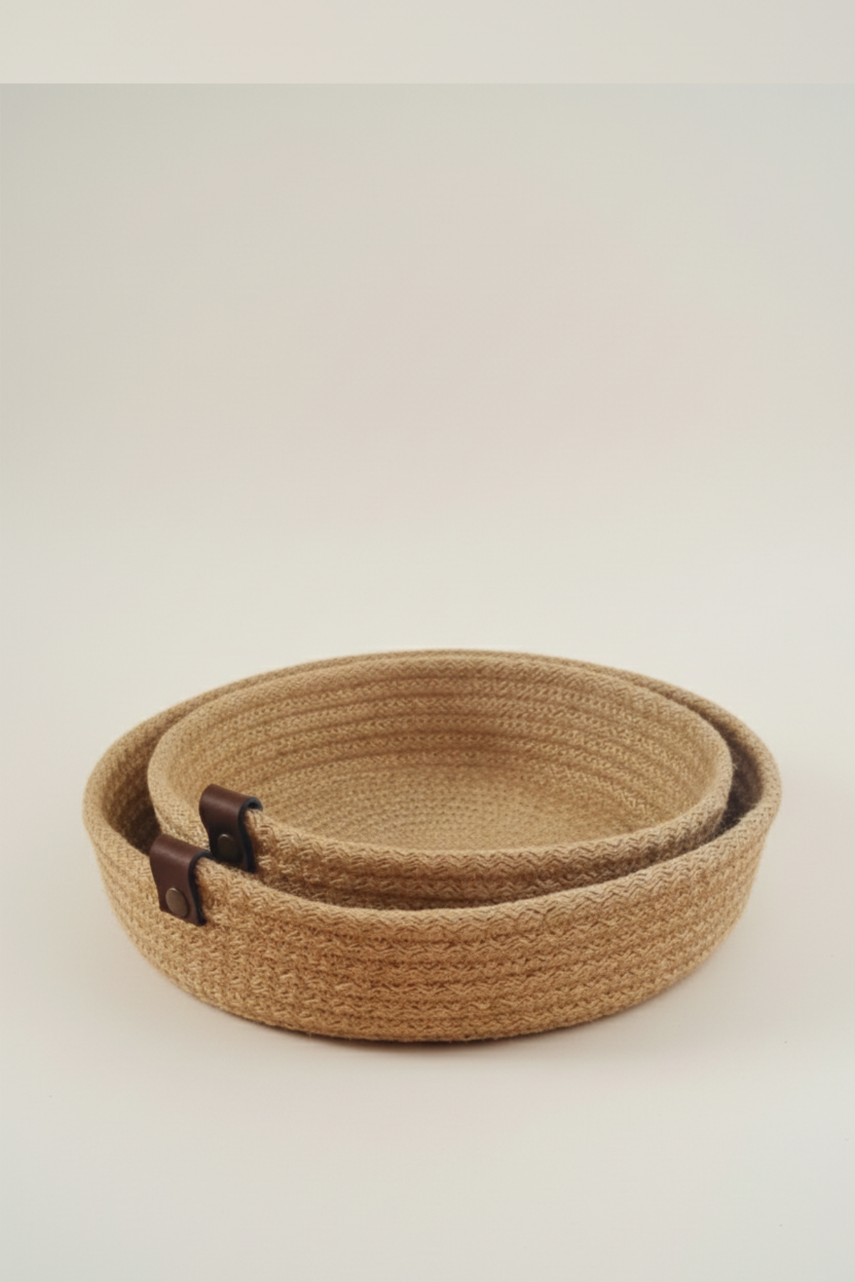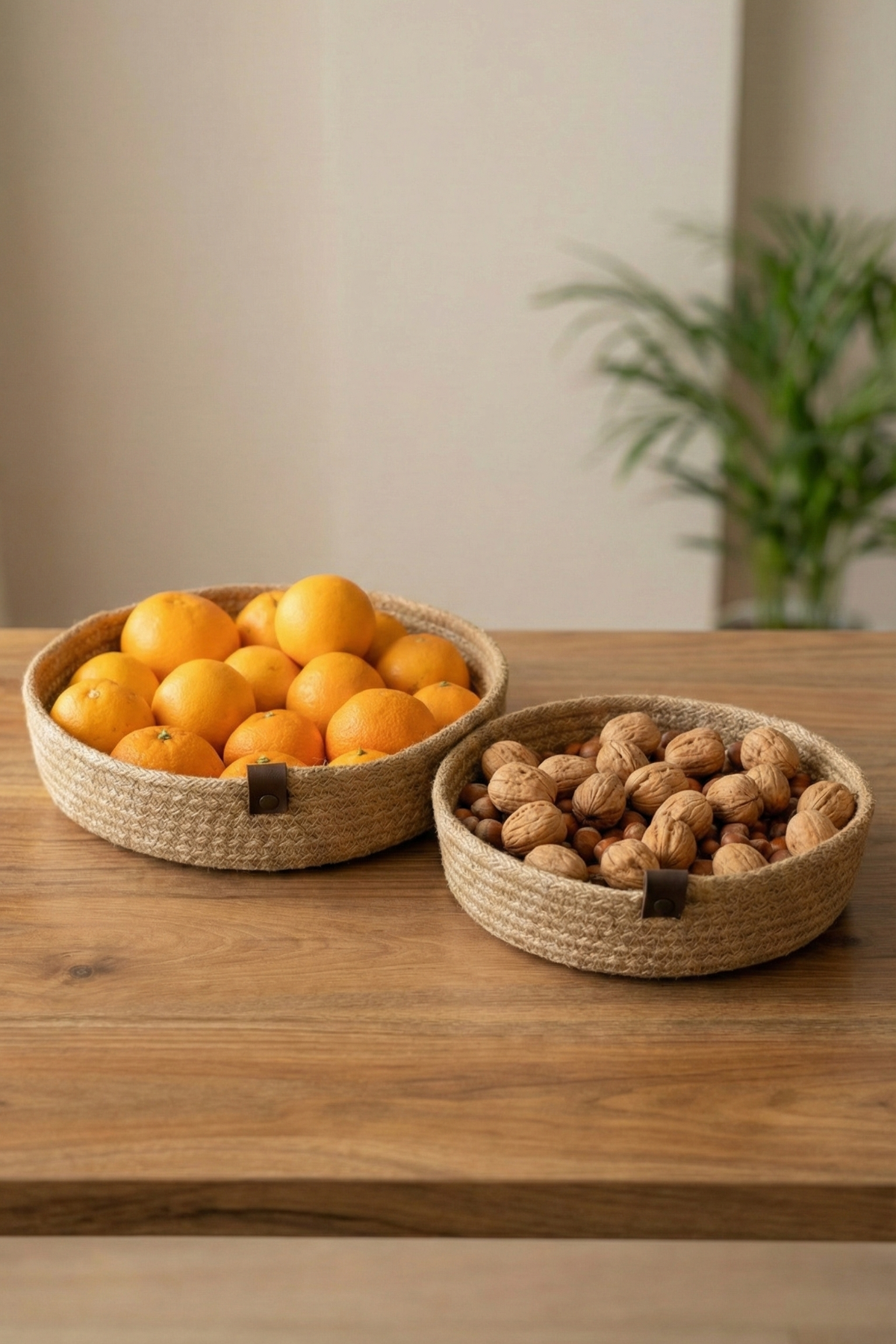 Doğal ve zarif bir tasarıma sahip 2'li Jüt Hasır Yuvarlak Sepet Seti, evinizin her köşesinde düzeni sağlarken şık bir dekorasyon parçası olarak da kullanılabilir. %100 doğal jüt malzemeden el işçiliği ile üretilmiş bu sepet, hem dayanıklı hem de çevre dostu bir üründür.