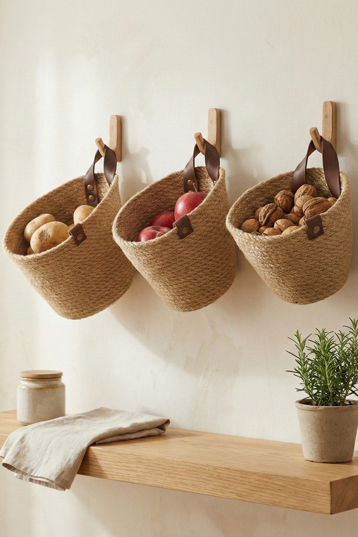 3lü Askılı Jüt Sepet, Hasır Sepet Duvara Asılabilir, Mutfak Organizer, Jüt Hasır Askılı Sepet